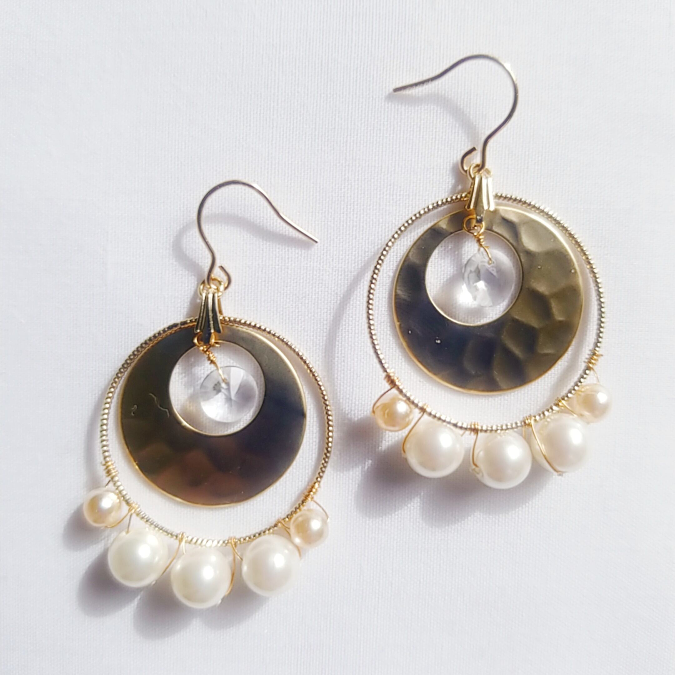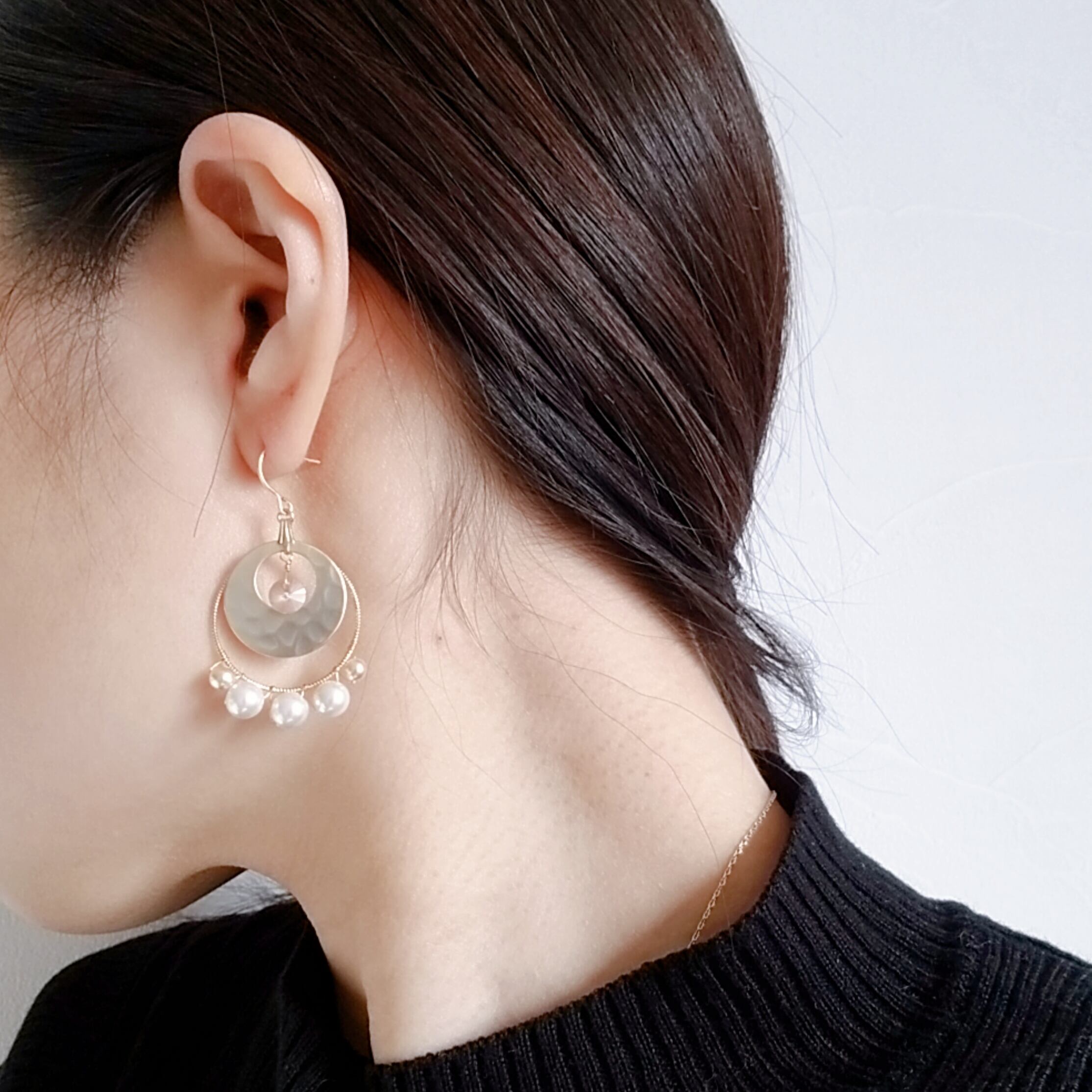 雲のあいだからあらわれた、明るく輝く満月をイメージした耳飾り。 耳もとで夜空の星群のような、シャラシャラとした鈴のような音が聴こえるかも。 サイズ(約):縦 4.5㎝×横 2.5㎝